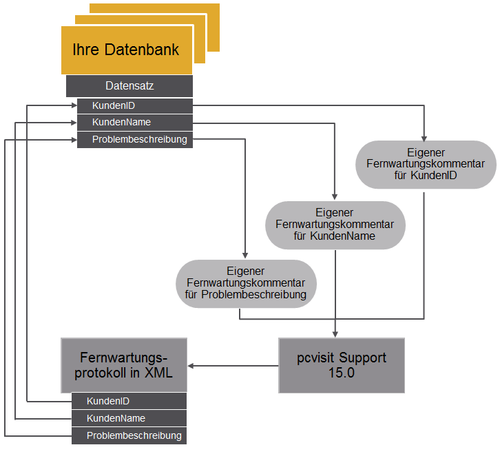 Folgende Abbildung veranschaulicht grafisch an einem fiktiven Beispiel, wie aus den Datenfeldern „KundenID“, „KundenName“ und Problem (Fallbeschreibung) zuerst Fernwartungskommentare erstellt werden, welche sich nach der Fernwartung im Fernwartungsprotokoll wiederfinden. Von dort können sie extrahiert und in Ihre Datenbank geschrieben werden. (Beispiel 3 in dieser Anleitung ist an diesen fiktiven Fall angepasst.)
