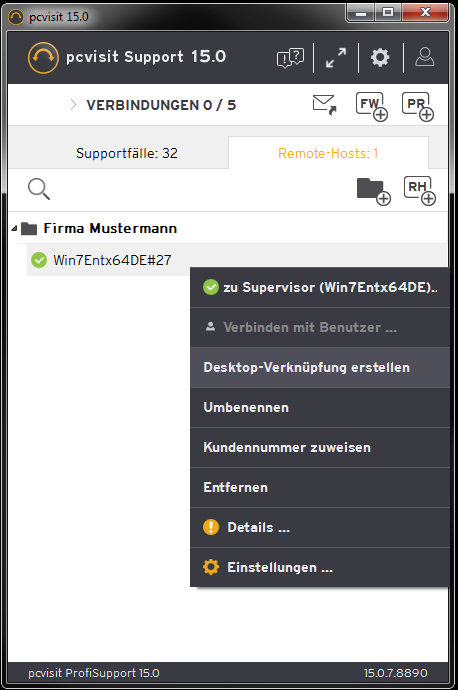 In Ihrem pcvisit Supporter-Modul mit der rechten Maustaste auf einen Remote-Host in der Liste klicken und “Desktop-Verknüpfung erstellen” anwählen (vgl. Abbildung rechts)
