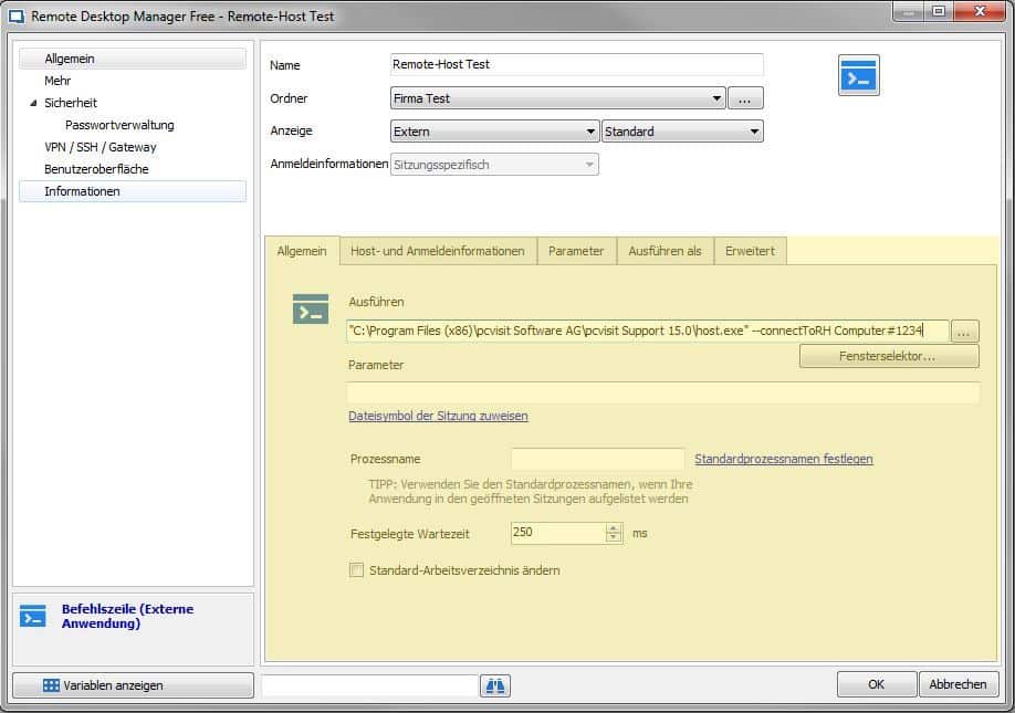 Dies kann z.B: im Remote Desktop Manager genutzt werden, um seine Remote-Computer übersichtlicher zu gestalten und besser zu verwalten (aufgeräumter Werkzeugkasten). pcvisit (Remote-Hosts) kann somit in andere Software integriert werden.