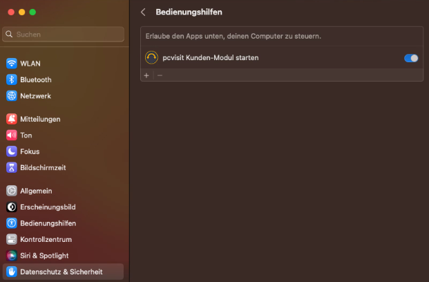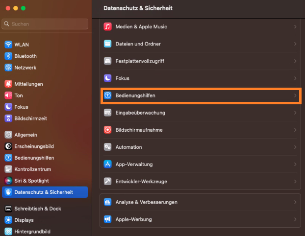 Um die Fernsteuerung auf Ihrem Mac zu ermöglichen, muss die Freigabe für die Bedienungshilfen gesetzt werden. Navigieren Sie dafür zurück zu “Datenschutz & Sicherheit” und öffnen Bedienungshilfen:
