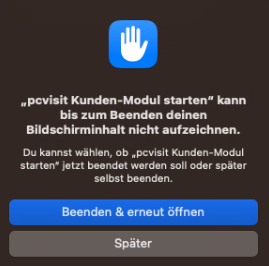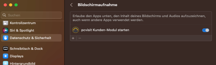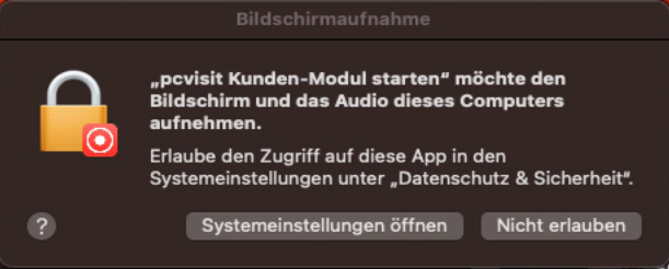 Bei der ersten Fernwartung/ Sitzung zu einem Kunden-Modul auf einem macOS-Gerät wird der Benutzer darauf hingewiesen, dass die Bildschirmaufnahme aktiviert werden muss. Ohne diese Zugriffseinstellung kann das Kunden-Modul keine Bildinformationen an die Supporter-Seite (Supporter-Modul, pcvisit Webapp) übertragen: