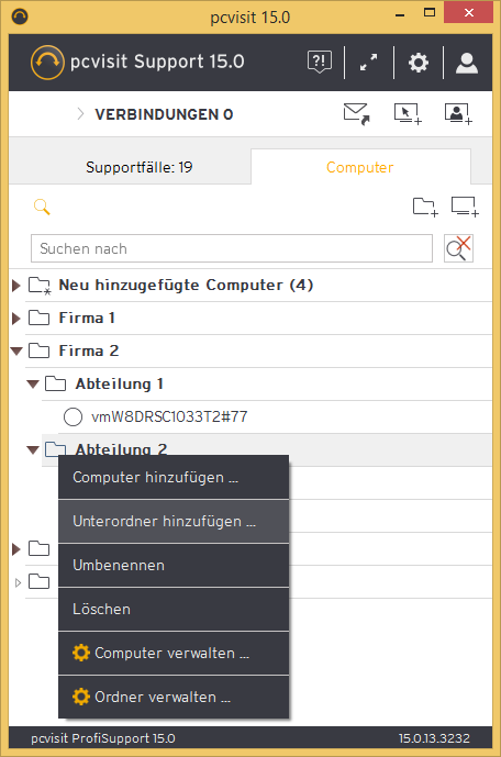 Es gibt verschiedene Möglichkeiten, einen Computer zur Computerliste hinzuzufügen. Neu installierte pcvisit Remote-Hosts werden im Ordner Neu hinzugefügte Computer angezeigt.