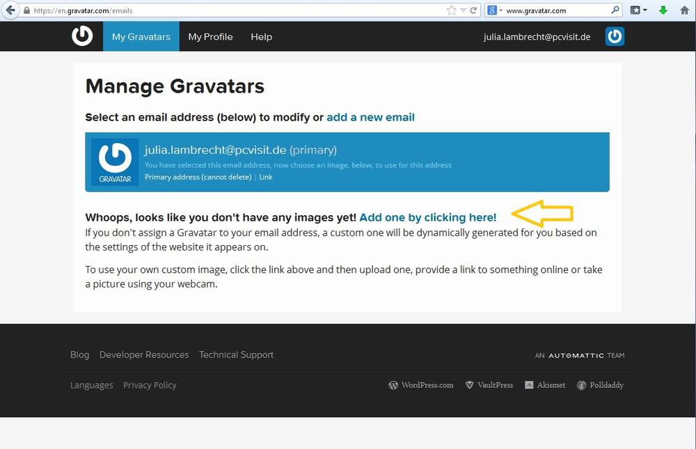 7. … und Sie gelangen zur Nutzerverwaltung. Hier können Sie Ihre(n) Gravatar(e) verwalten und z.B. mittels „Fügen Sie ein indem Sie hier klicken“ ein neues Avatar-Bild hinzufügen.