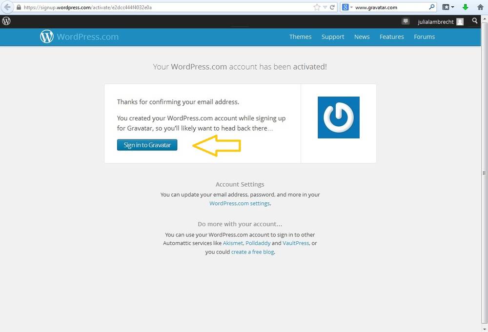 6. Sie gelangen auf eine Bestätigungs-Landingpage. Klicken Sie nun auf „Sign in to Gravatar“...