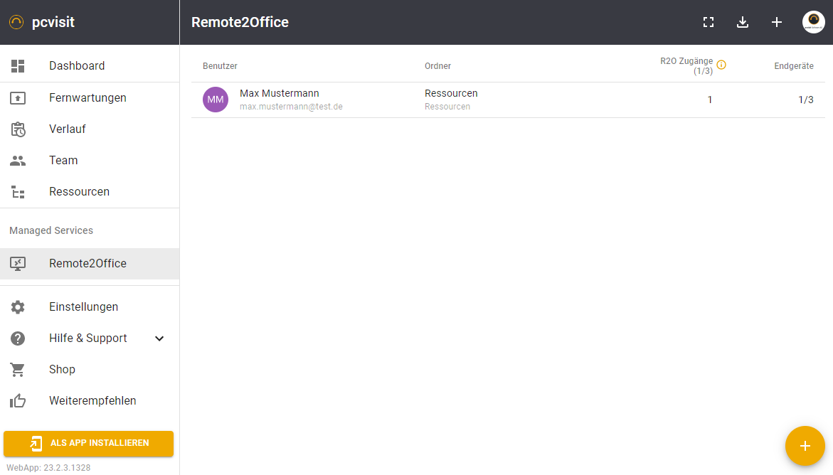 Melden Sie sich als mit Ihrem Login in der MobileSupport an und wählen Sie auf der linken Seite “Remote2Office” aus. In der Übersicht finden Sie alle Benutzer mit aktiven Remote2Office-Zugängen.