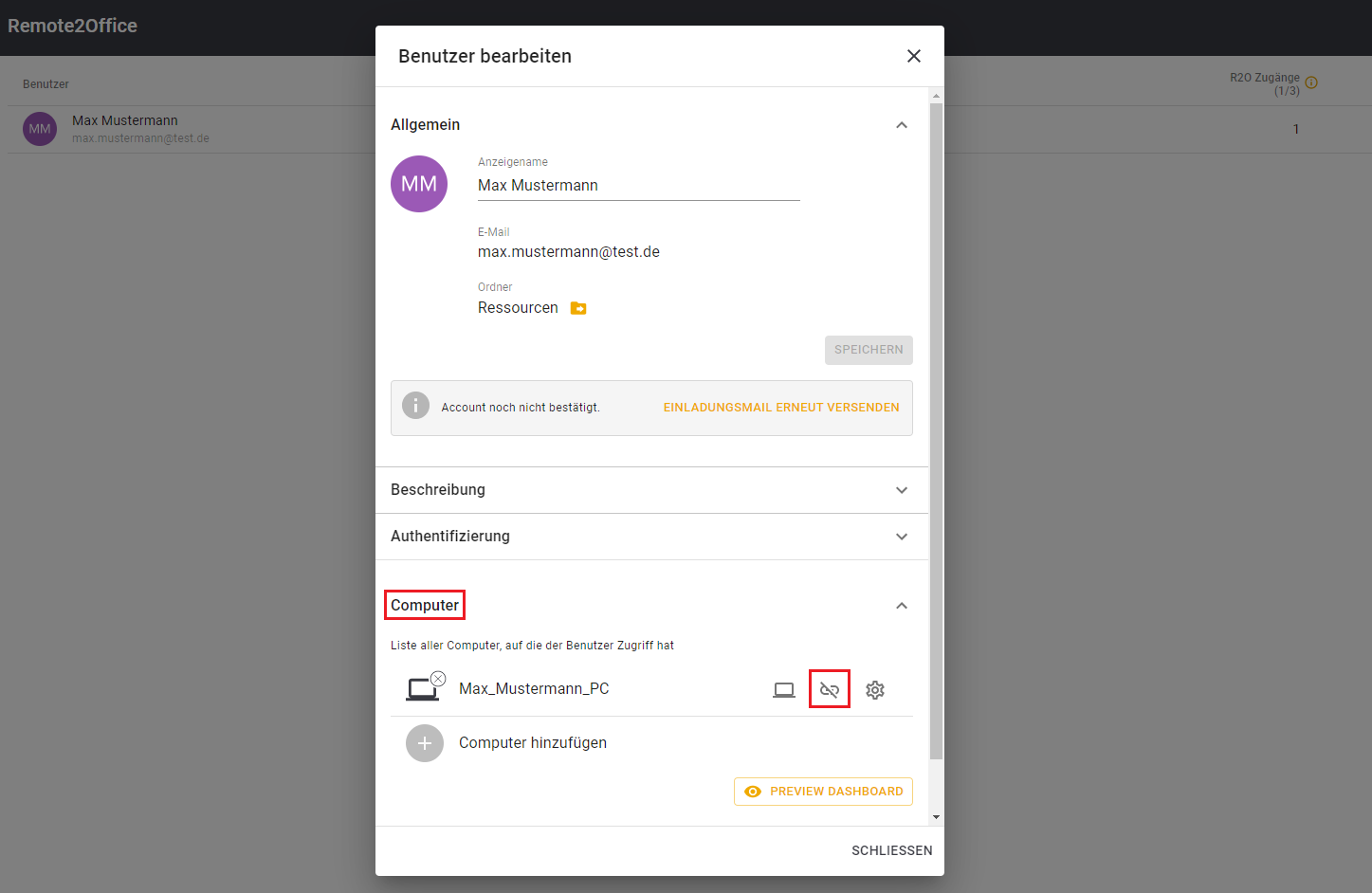 Unter dem Punkt “Computer” sehen Sie alle freigegebene Computer des Nutzers. Wenn Sie mit dem Maus über einen freigegeben Computer fahren, werden 3 zusätzliche Buttons sichtbar. Der mittlere Button (durchgestrichene Kette) entzieht den Zugriff auf diesen Computer für den Nutzer. Wenn alle freigegebenen Computer entfernt wurden, ist die Remote2Office Lizenz wieder verfügbar und der Nutzer wird in der Übersicht nicht mehr angezeigt. Die Lizenz kann für einen anderen Nutzer verwendet werden.