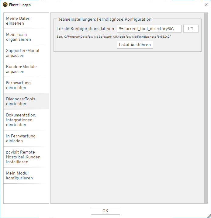 Im Supporter-Modul unter Einstellungen - Diagnose-Tool einrichten - Lokal Ausführen kann die pcvisit Ferndiagnose lokal gestartet und anschließend zur Verwendung auf dem Kunden-System / Remote-PC angepasst werden.