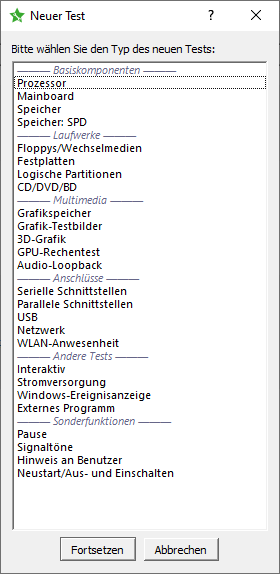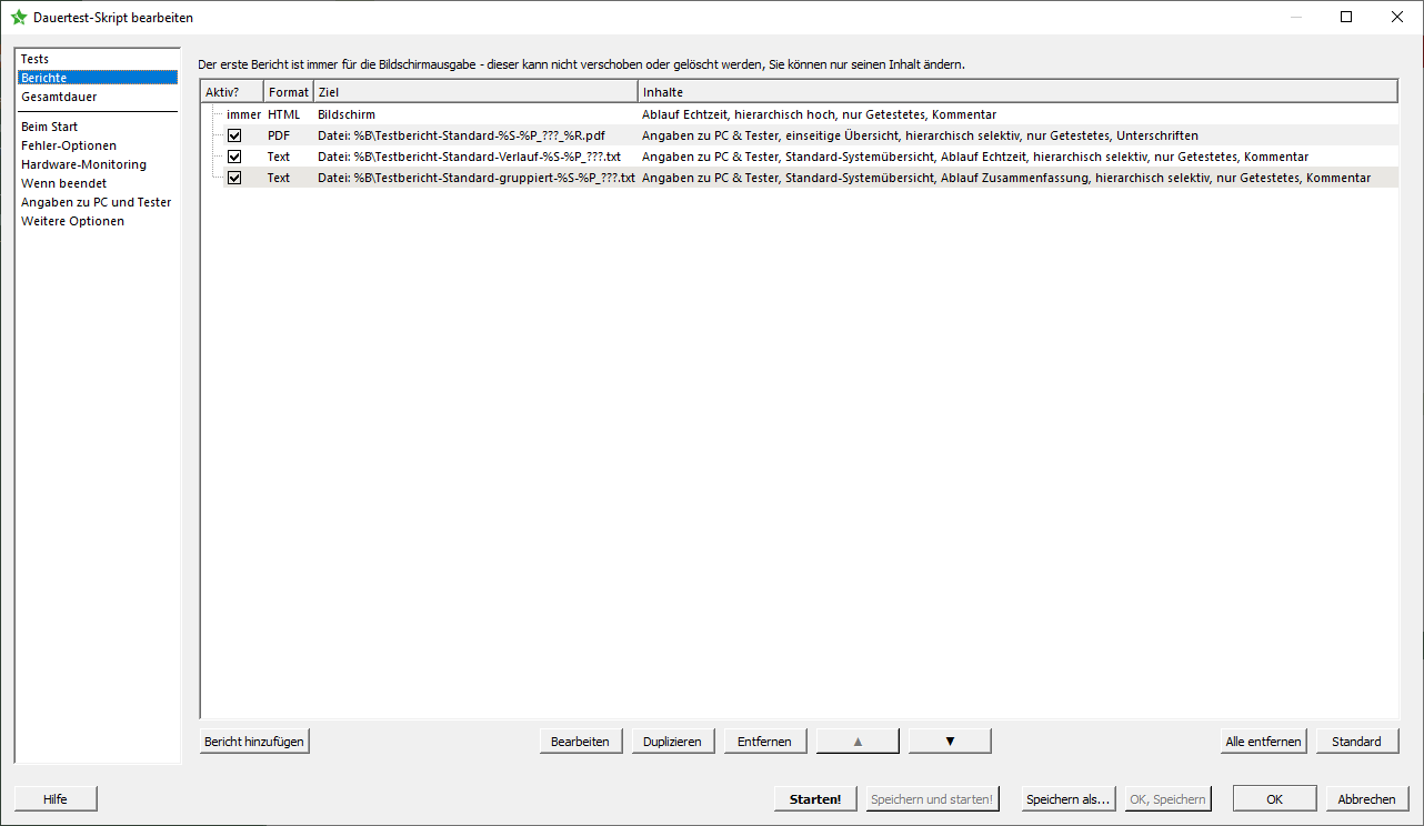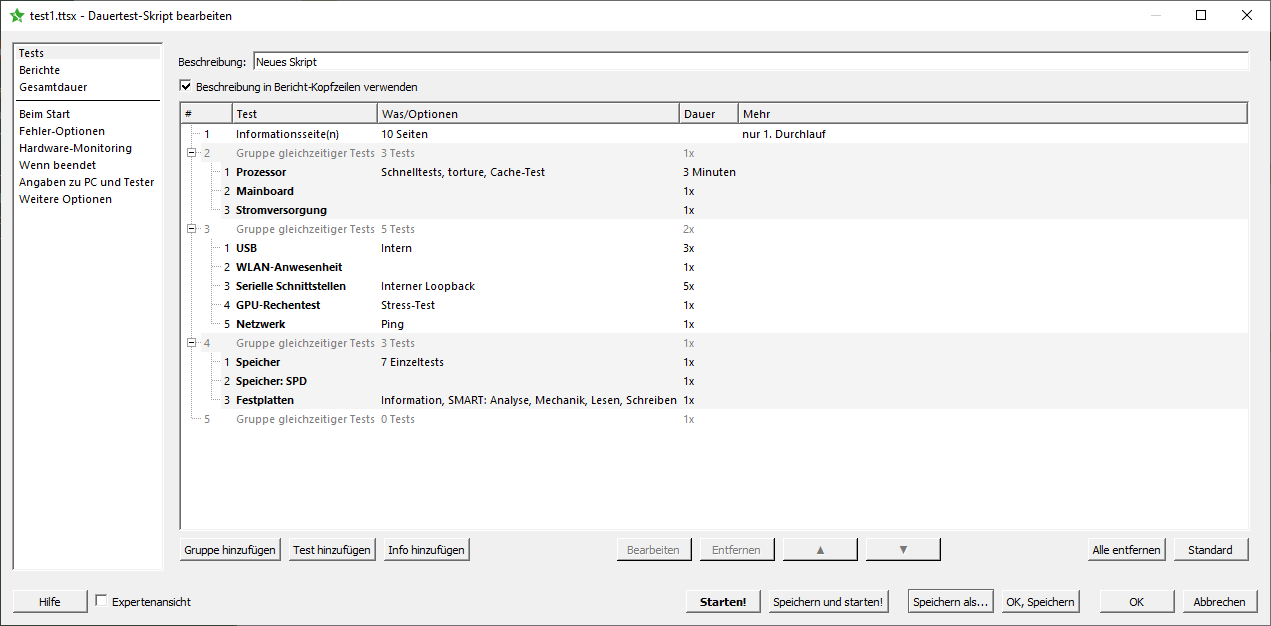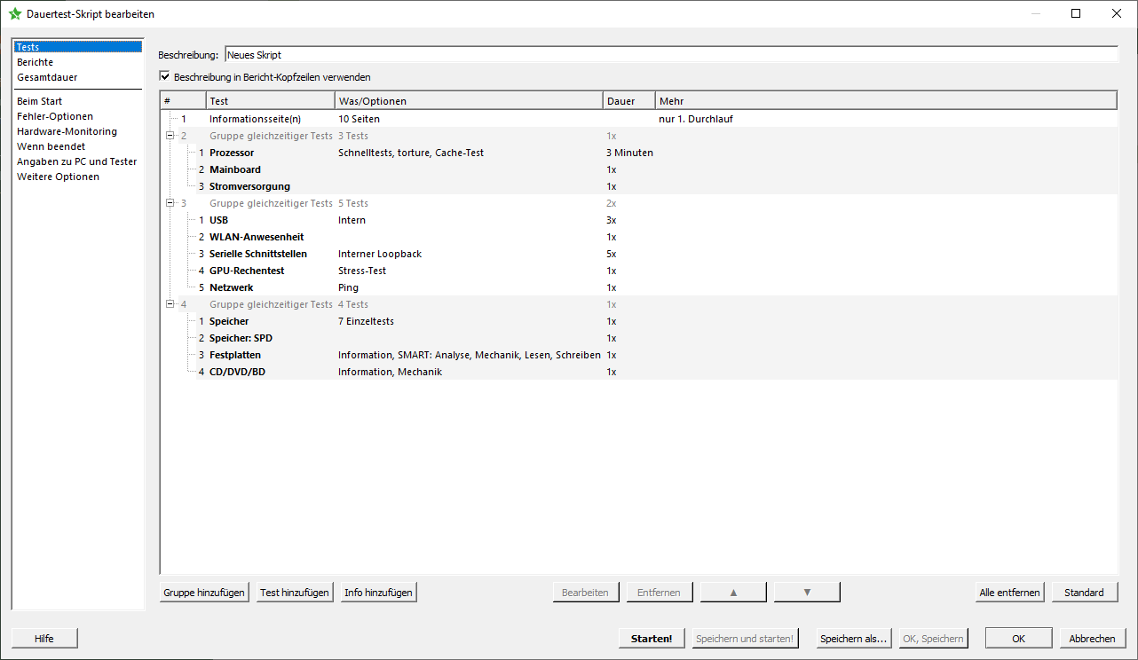 Im folgenden Fenster werden Tests einzeln hinzugefügt, bearbeitet oder entfernt. Gruppierte Tests werden nach dem Start gleichzeitig ausgeführt.