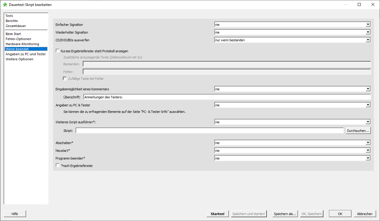 Über die Seitenleiste können noch weitere Optionen gesetzt werden, wie beispielsweise Aktionen, die zum Ende des Tests ausgeführt werden oder wie im Fehlerfall während des Tests reagiert werden soll: