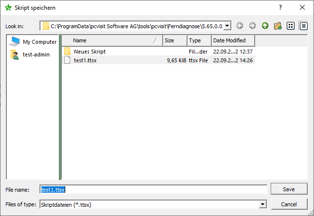 Achten Sie darauf, die .ttsx im gleichen Ordner zu speichern, aus dem die pcvisit Ferndiagnose lokal gestartet wurde. Der Standardpfad lautet C:\ProgramData\pcvisit software ag\tools\pcvisit\Ferndiagnose\5.65.0.0. Andernfalls erkennt pcvisit Ferndiagnose das gespeicherte Skript nicht und kann somit nicht auf dem Kunden-System / Remote-PC genutzt werden.