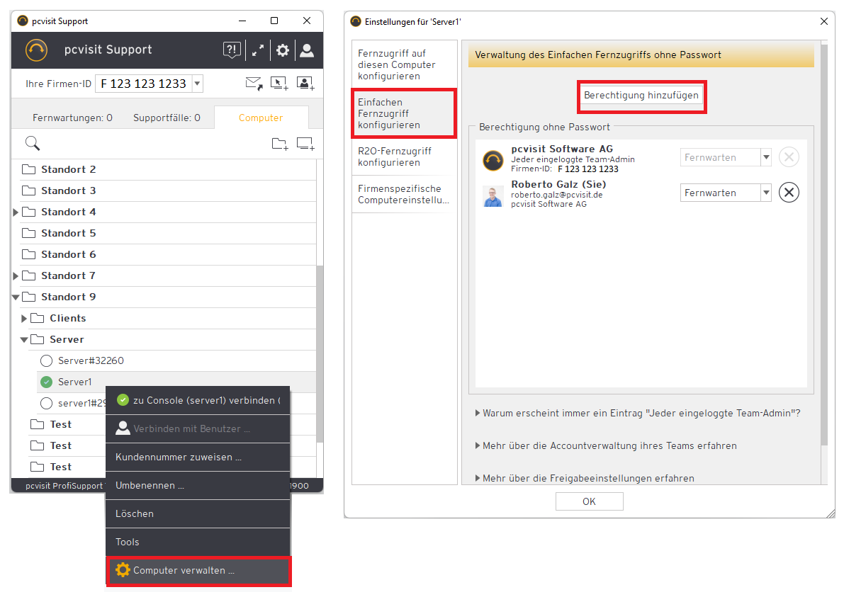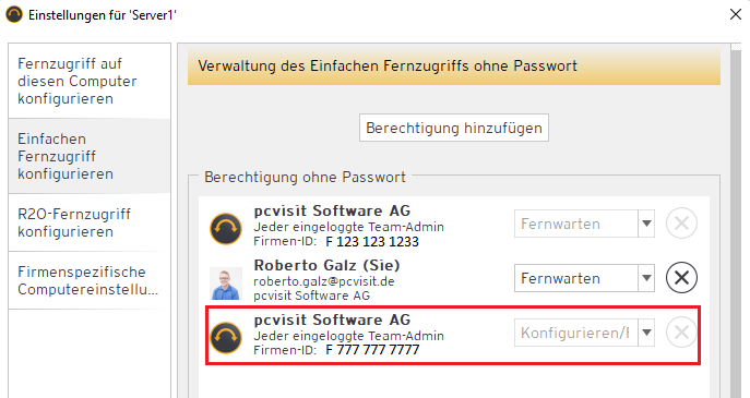 Über das Supporter-Modul wählen Sie den betroffenen Remote-Host per Rechtsklick aus und öffnen “Computer verwalten …”. Über den Reiter “Einfachen Fernzugriff konfigurieren” und “Berechtigung hinzufügen” können Sie den Remote-Host für eine fremde Firmen-ID freigeben.