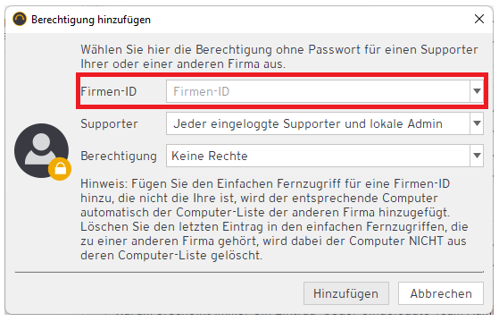 Löschen Sie Ihre eigene Firmen-ID im Feld Firmen-ID und tragen Sie die fremde Firmen-ID ein. Unter “Berechtigung” können Sie festlegen, ob nur die Fernwartung möglich sein soll oder ob auch ein Zugriff auf die Einstellungen des Remote-Hosts gewünscht sind.