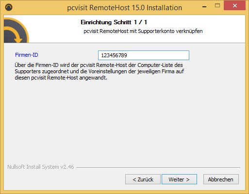 Die Firmen-ID des Supporters ist bereits voreingestellt. Bestätigen Sie diese mit “Weiter”