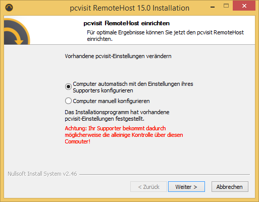 Wählen Sie “Computer automatisch mit den Einstellungen Ihres Supporters konfigurieren” und klicken Sie auf “Weiter”.