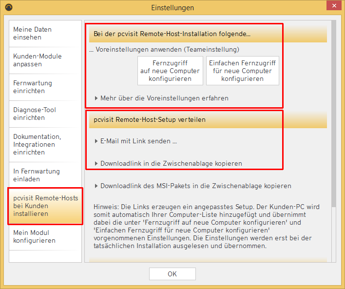 Sie können ein vorkonfiguriertes Setup für den Remote-Host nutzen, damit jeder zukünftig installierte Remote-Host dieselben Einstellungen erhält und der Remote-Host in der Computer-Liste im Supporter-Modul automatisch hinzugefügt wird.