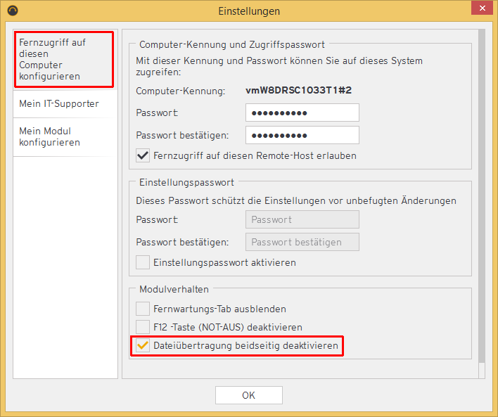 In den Einstellungen des Remote-Host-Moduls lässt sich die Dateiübertragung deaktivieren.