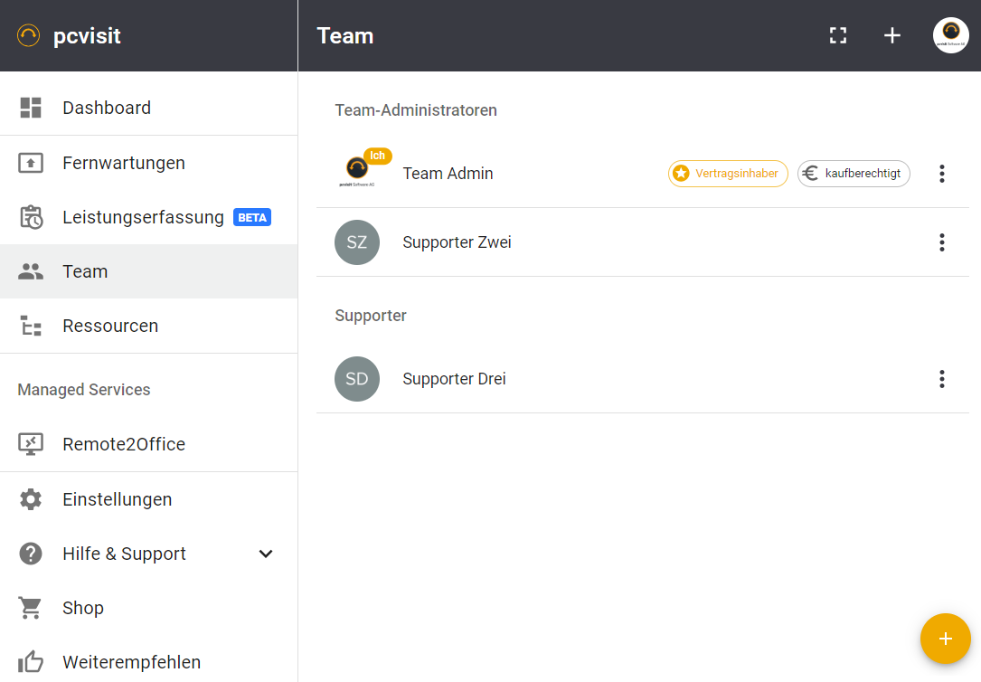 Melden Sie sich zur Verwaltung Ihres Team in der pcvisit MobileSupport an und unter “Team” finden Sie die Verwaltung Ihrer Kollegen.