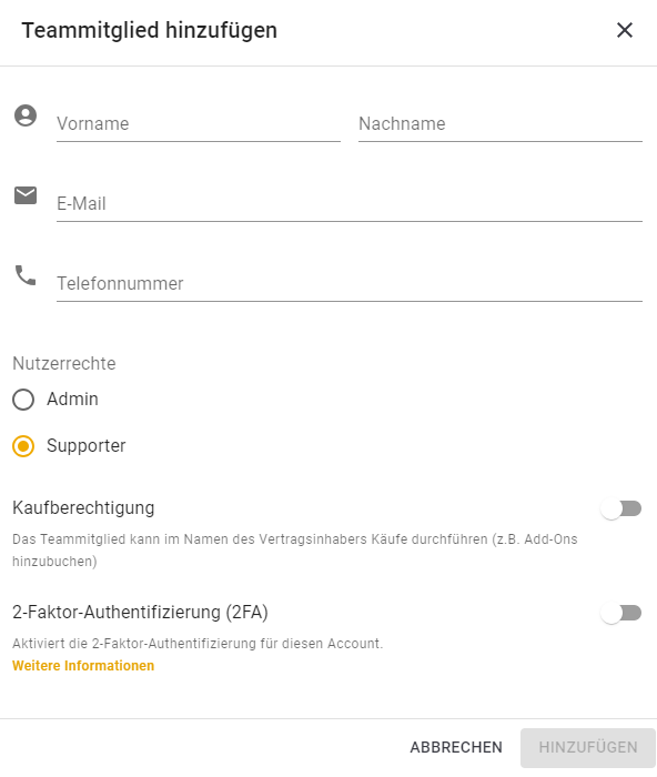 Geben Sie hierzu den Namen und die E-Mail Adresse des Nutzers an. Die Angabe der Telefonnummer ist optional. Außerdem müssen Sie noch angeben, welche Rolle der Nutzer haben soll und ob die Person die Kaufberechtigung (nur für Rolle Admin möglich) erhalten soll.