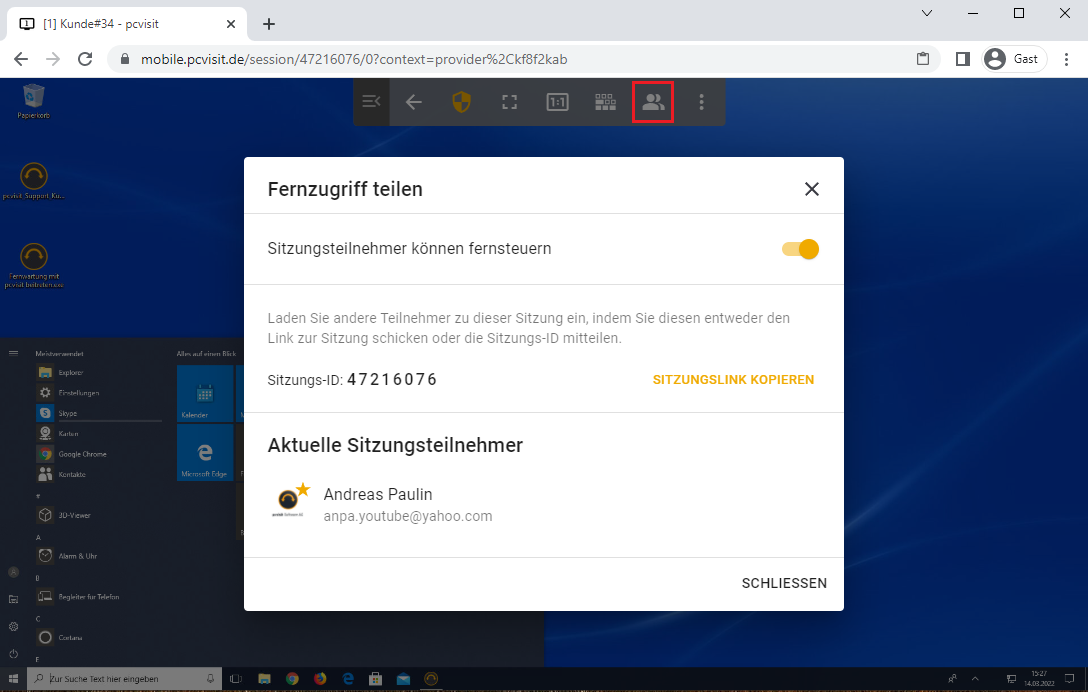 Als Host der Sitzung erhalten Sie eine Beitrittsnachfrage des eingeladenen Teilnehmers, die Sie bestätigen oder ablehnen können. Außerdem legen Sie fest, ob die eingeladenen Teilnehmer fernsteuern oder nur sehen und zeigen (eigener Mauszeiger) können.