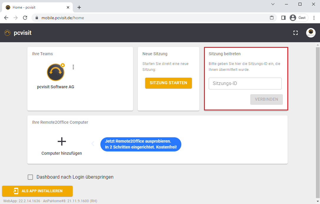 Melden Sie sich zu erst in der pcvisit Web App an und starten Sie die gewünschte Fernwartung.