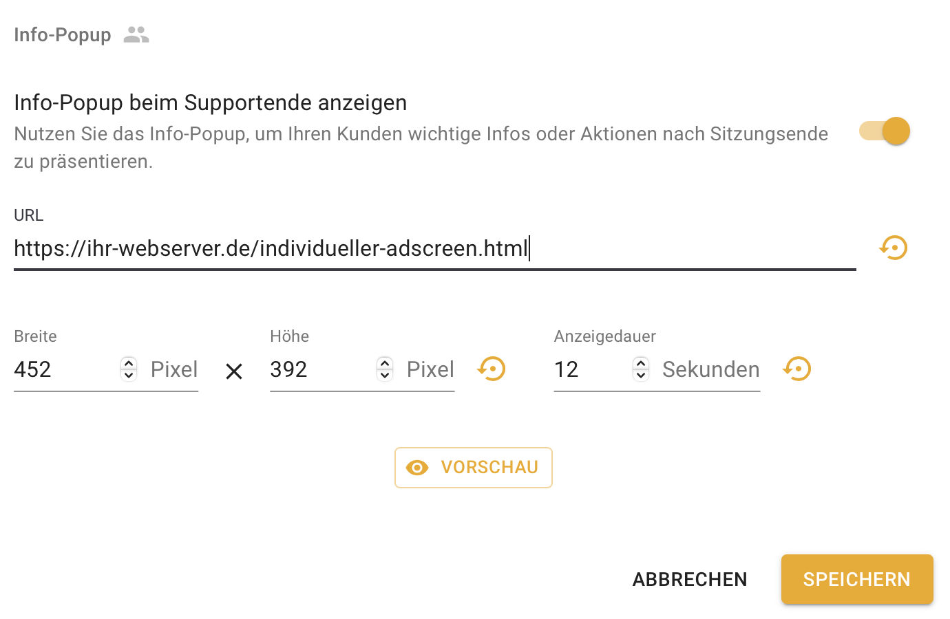 Tragen Sie alle notwendigen Daten (URL, Breite, Höhe, Anzeigedauer) in den Einstellungen des pcvisit Supporter Modul bzw. der Web App ein (Einstellungen → Kunden-Modul).