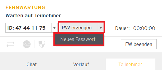 Tipp für zusätzliche Sicherheit: Über das Feld “PW erzeugen”, neben der Fernwartungs-ID, können Sie für diese Sitzung ein Passwort erzeugen, welches der Kunde zusätzlich zur Fernwartungs-ID eingeben muss.