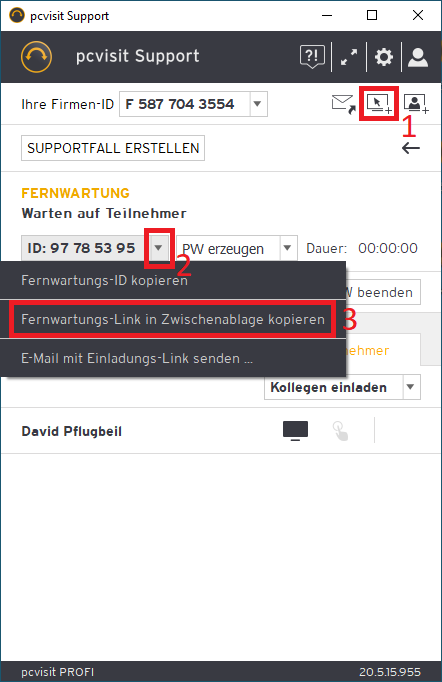 Erstellen Sie im Supporter-Modul eine Fernwartung und kopieren Sie den Fernwartungslink in die Zwischenablage: