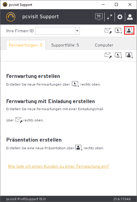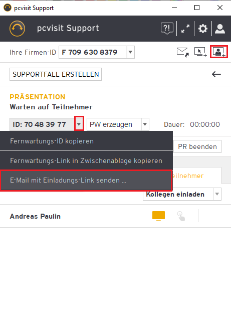 Erstellen Sie im Supporter-Modul eine Präsentation und teilen Sie Ihrem Kunden die Fernwartungs-ID mit.
