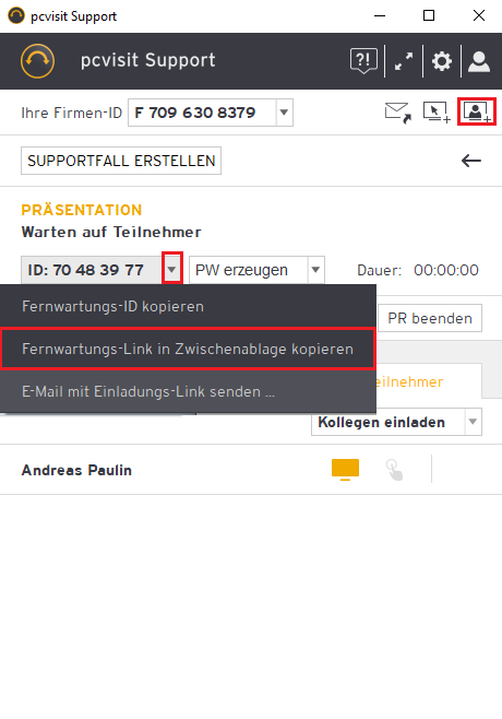 Erstellen Sie im Supporter-Modul eine Präsentation und kopieren Sie den Fernwartungslink in die Zwischenablage: