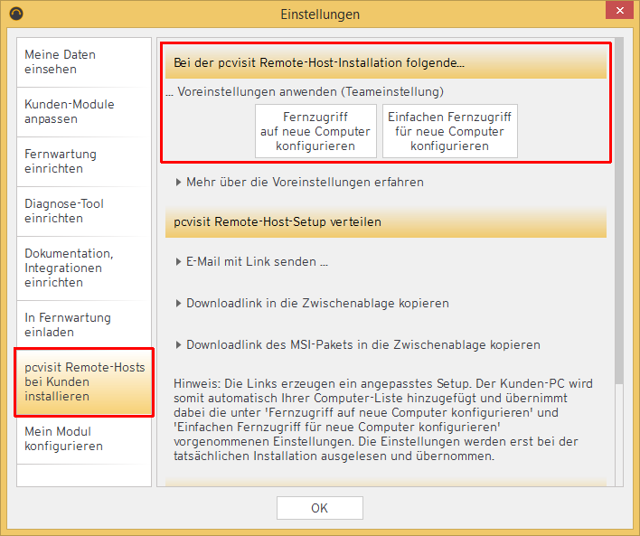 Für pcvisit Remote-Hosts lassen sich bereits vor der Installation in den Einstellungen des Supporter-Moduls Voreinstellungen festlegen: