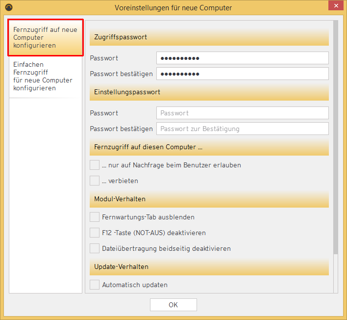 Den "Fernzugriff auf neue Computer konfigurieren" Sie, indem Sie die Schaltfläche aufrufen und die entsprechenden Einstellungen festlegen:
