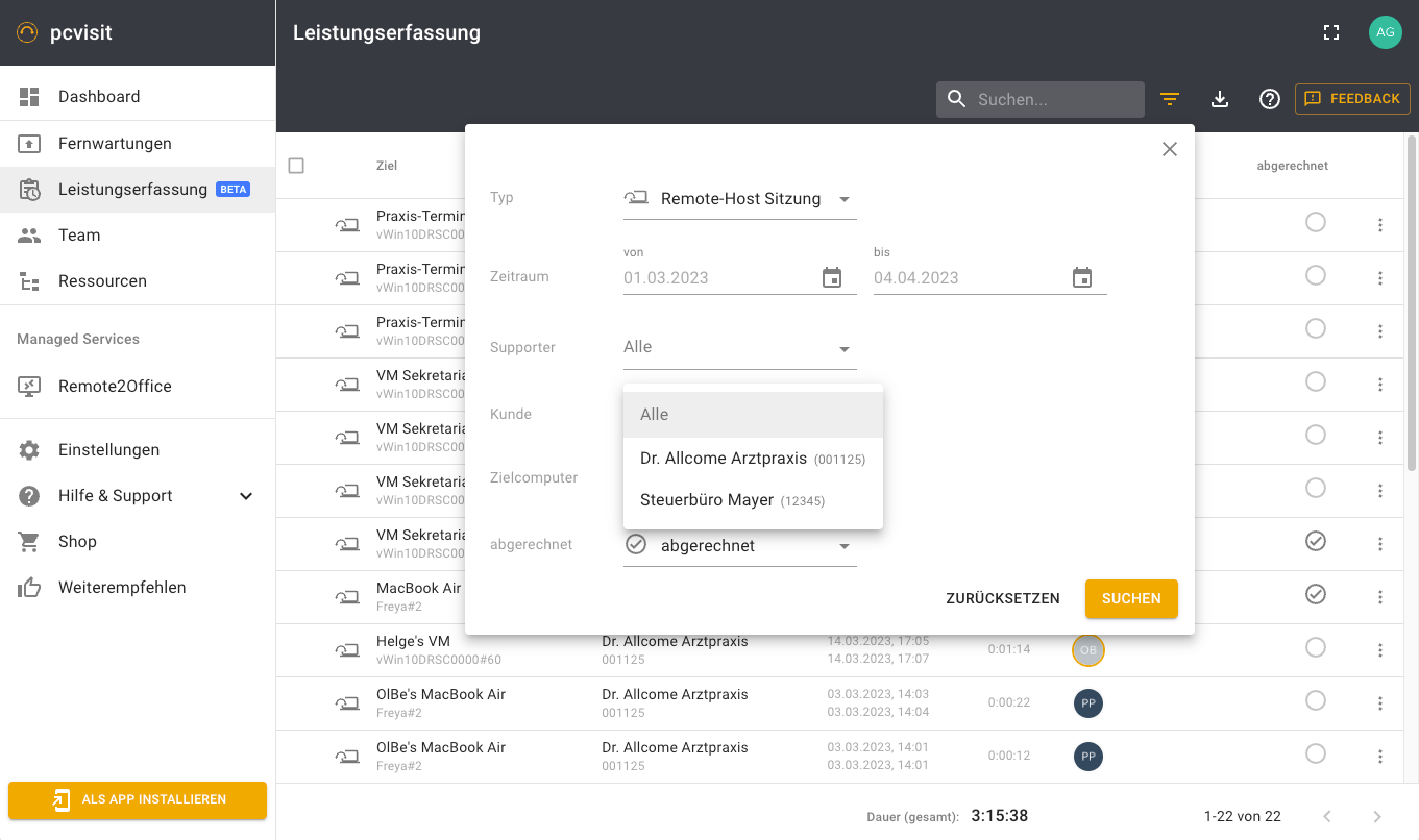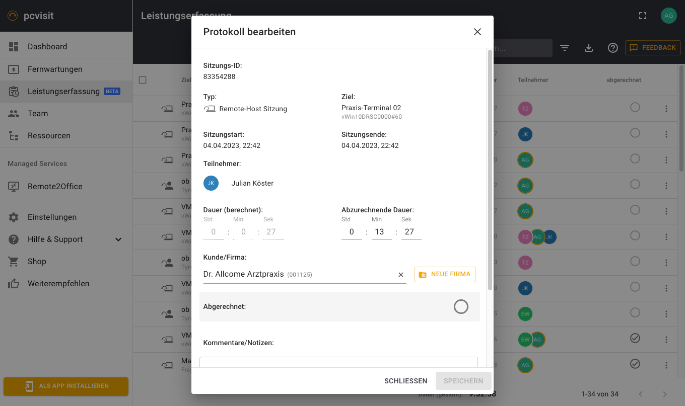 Alle aktiven Sitzungen Ihres Teams, welche mit der pcvisit Web App und dem Supporter-Modul durchgeführt worden sind, werden automatisch protokolliert und sind zentral in der pcvisit Web App abrufbar.