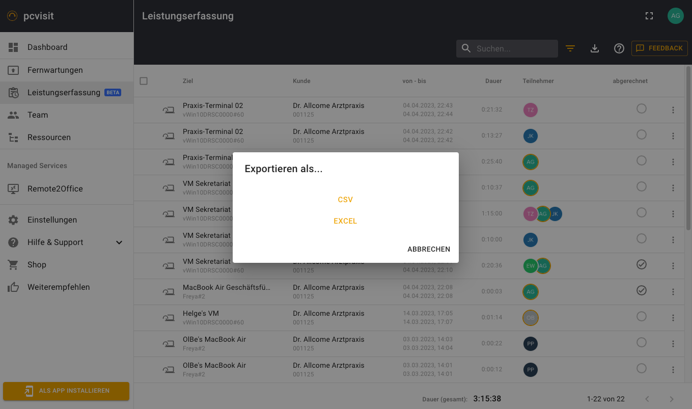Exportieren Sie die Daten der Leistungserfassung als CSV oder EXCEL (.xlsx), um sie zum Beispiel für die Abrechnung oder Dokumentation Ihrer erbrachten Leistungen zu nutzen.