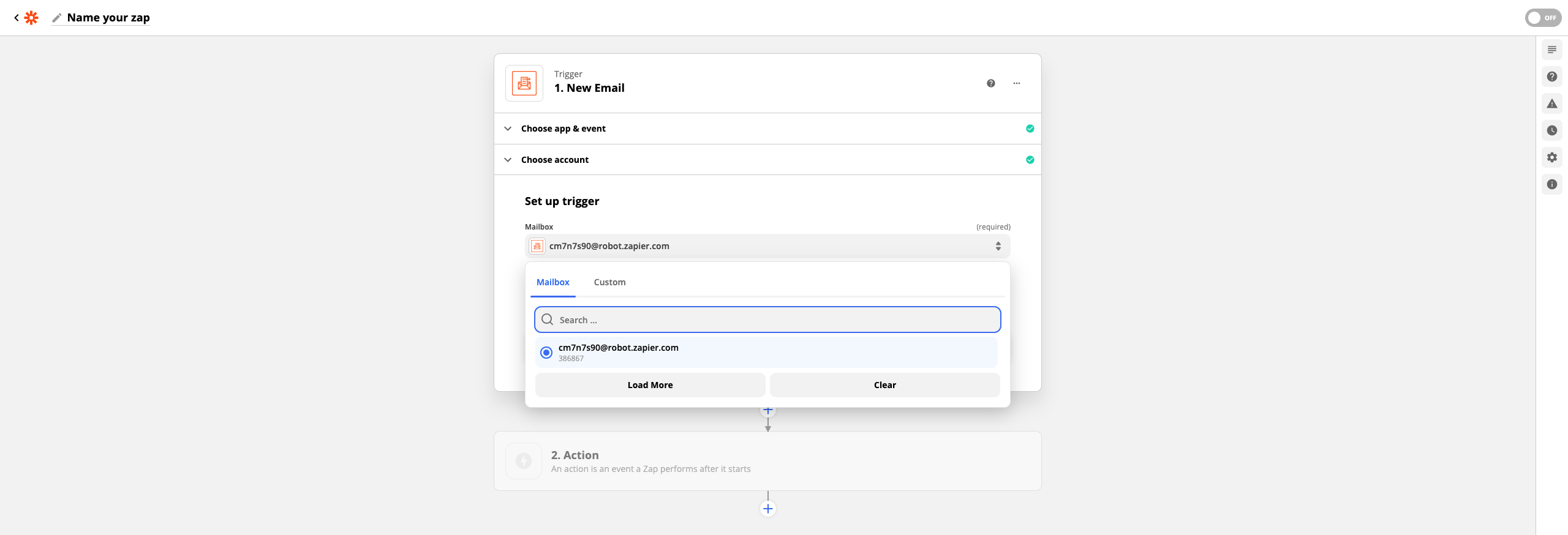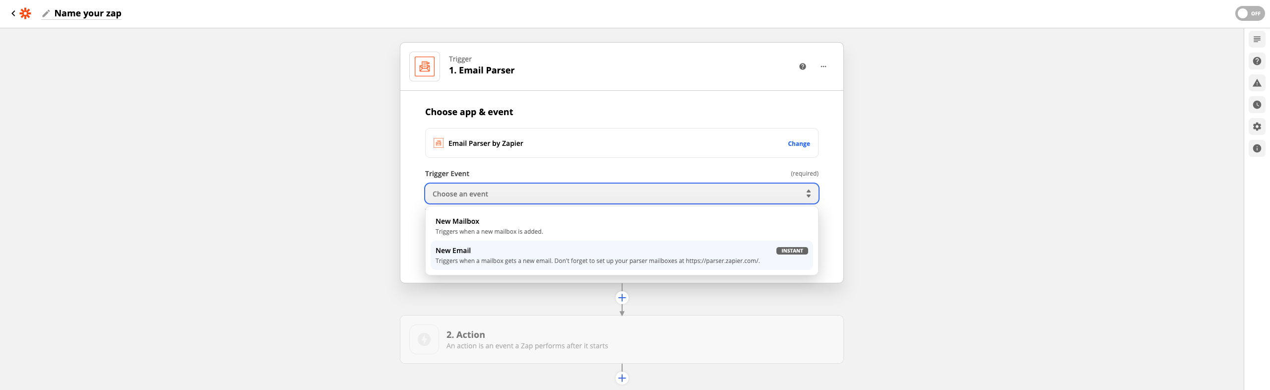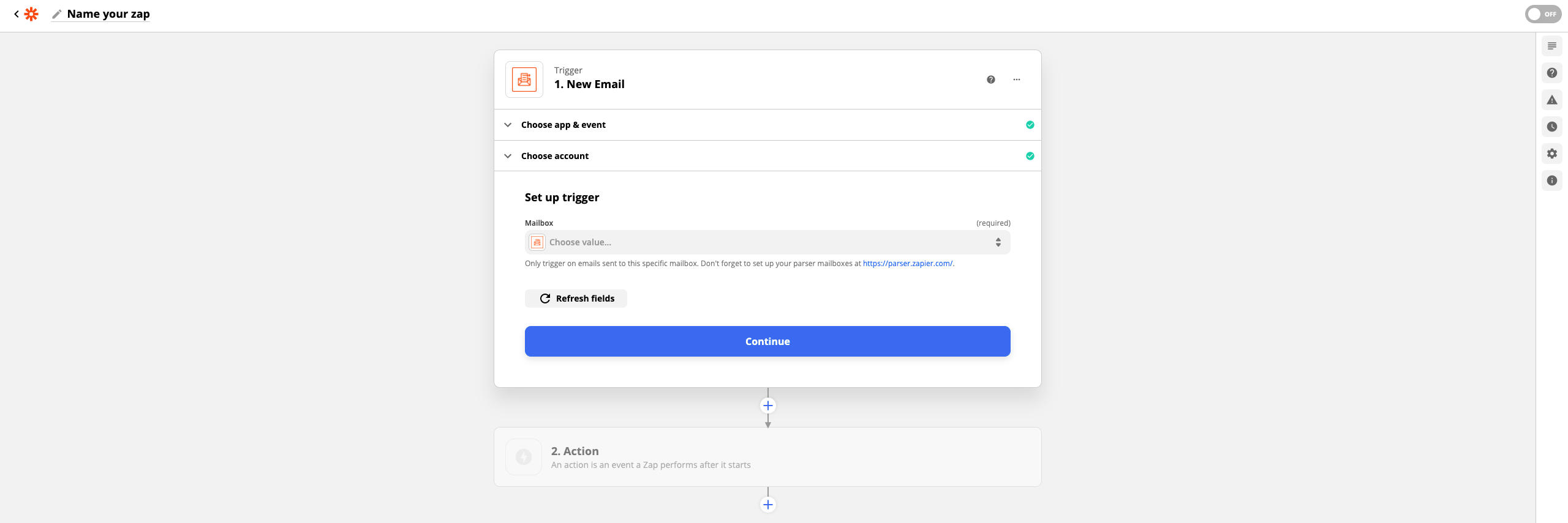 5. Falls Sie bereits einen E-Mail-Parser eingerichtet haben, können Sie diesen nun direkt auswählen. Andernfalls wählen Sie Sign in to E-Mail Parser by Zapier.