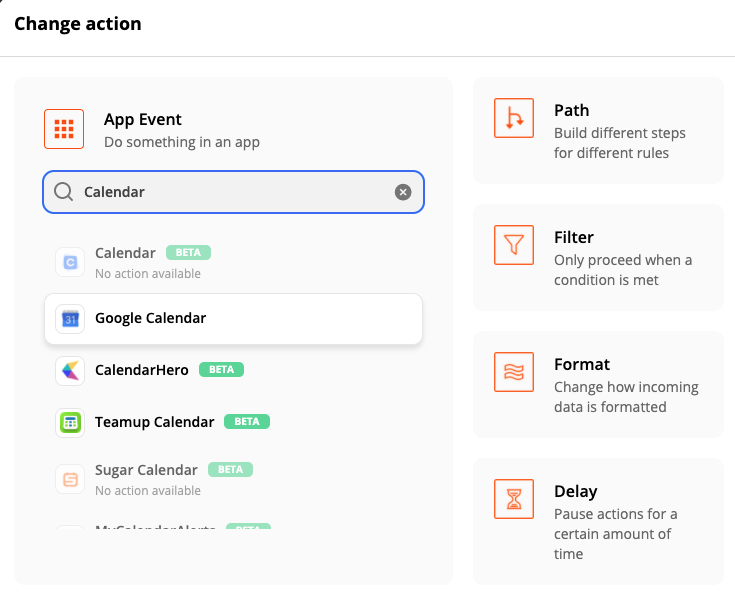 Für dieses Beispiel nutzen wir Google Calendar. Die Auswahl an verknüpfbaren Apps ist jedoch enorm und die Möglichkeiten, Ihre Protokolle in verschiedene Systeme und Apps zu integrieren, schier grenzenlos. Ausgangspunkt ist hierbei immer die geparste E-Mail inkl. der vergebenen Variablen. Die nachfolgenden Schritte unterscheiden sich dann je nach gewählter Action im Ablauf, der Authentifizierung usw.