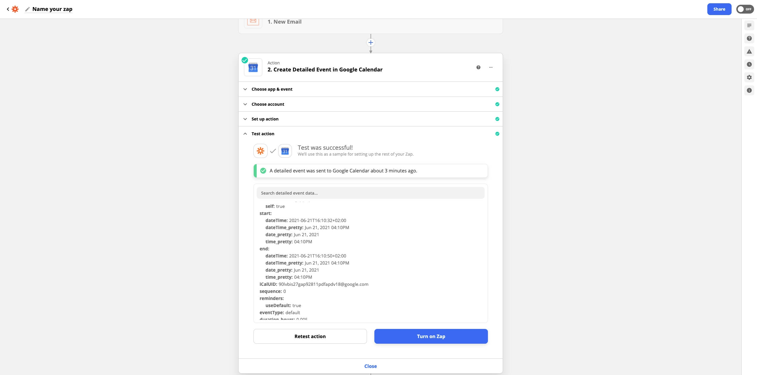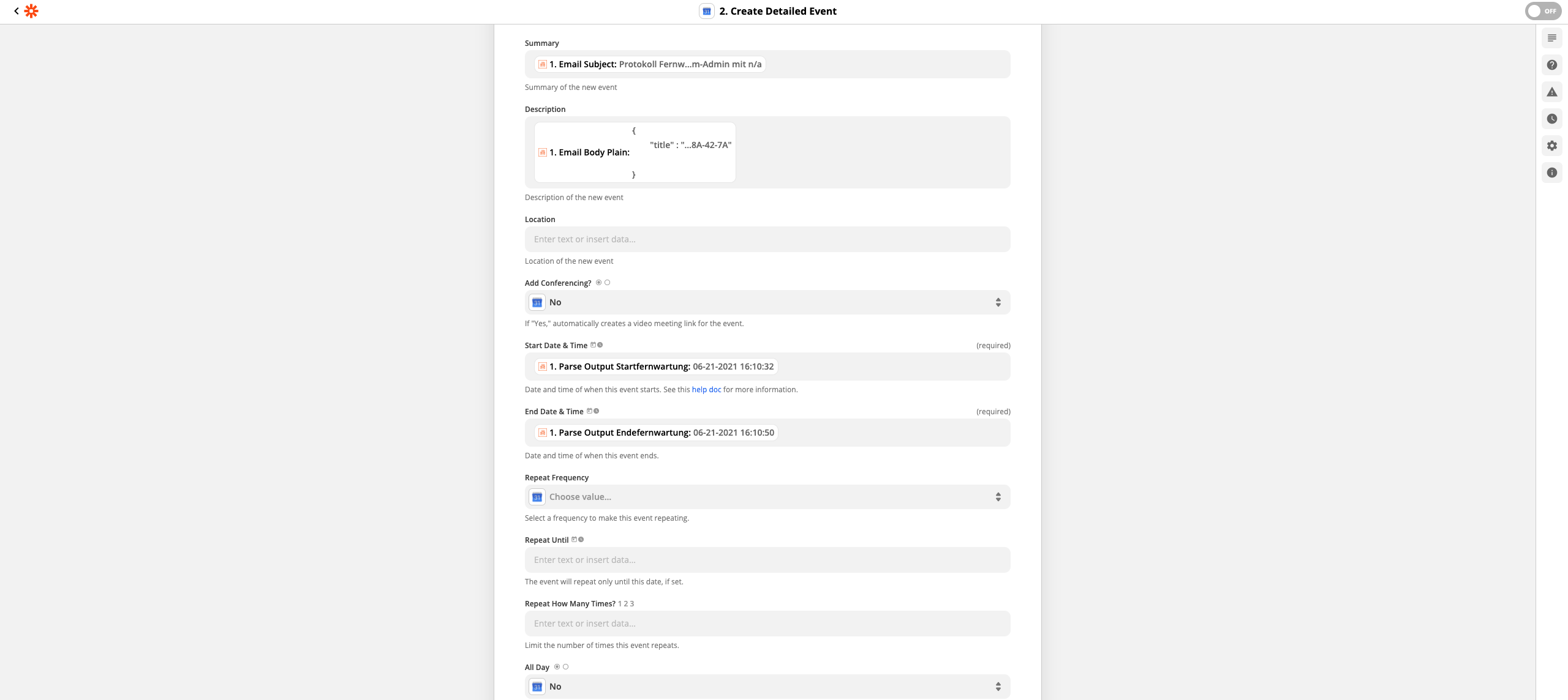 26. Sie können diesen Zap jetzt mit Turn on Zap abschließen. Die Erstellung des Zaps ist nun abgeschlossen! Alle zukünftigen Fernwartungen, nach welchen ein Protokoll verschickt wird, werden nun in diesem Format in Ihren Google Kalender eingetragen.